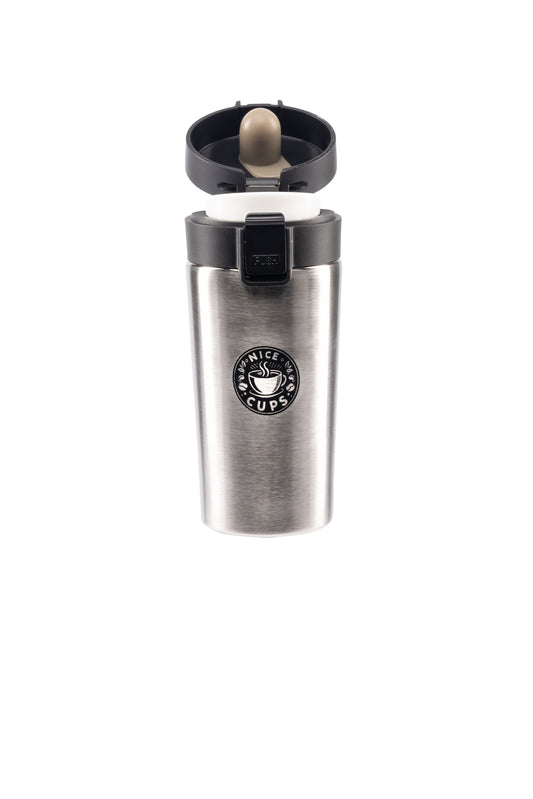 Nice Cups Stainless Steel Vacuum Insulated Tumbler – Double Wall, Leak-Proof, Lockable Push Button Lid, Keeps Drinks Hot 8H & Cold 12H – Travel Mug for Coffee, Tea or Water (Silver, 13oz)
